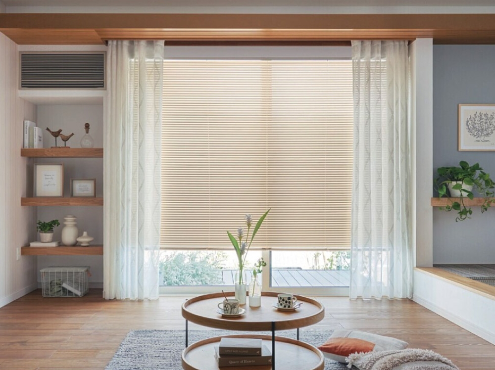 室内側には遮熱素材のレースカーテンをプラスして、機能的ながら温もりを感じられる優しいブラインドコーディネートです。