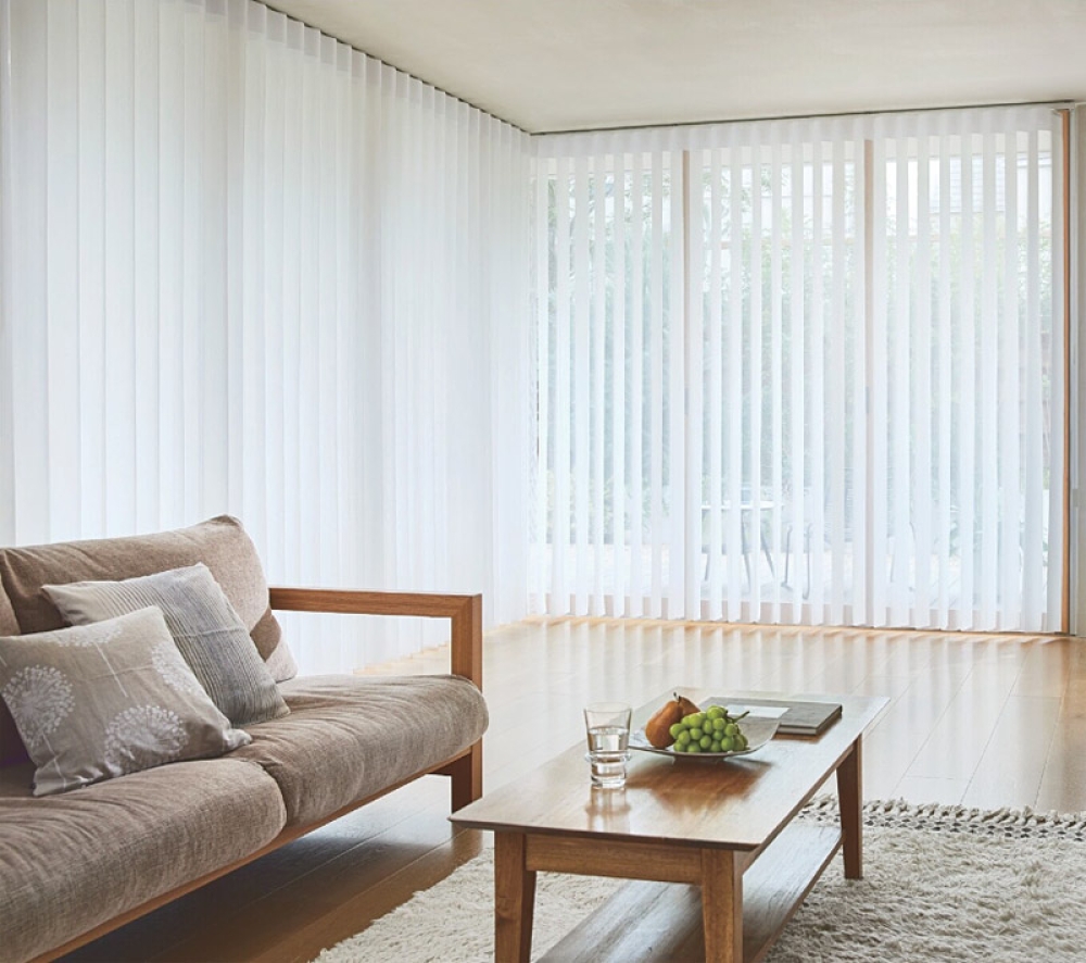 タテ型ブラインドの調光機能と、カーテンのやさしい雰囲気をあわせもつ、タチカワブラインドの調光タテ型ブラインド「エアレ」です。