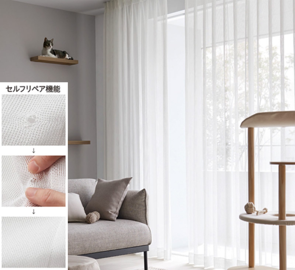 そこでおススメなのが、今回リリカラから登場した、セルフリペア機能付きのレースカーテン「耐猫レース」です。